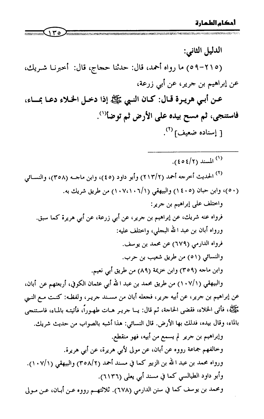 والبيهقي (١/ ١٠٧) من طريق محمد بن عبد الله أبي عثمان الكوفي، أربعتهم عن أبان، عن إبراهيم بن جرير، عن أبيه جرير، فجعله أبان من مسند جرير، ولفظه: كنت مع النبي - صلى الله عليه وسلم -، فأتى الخلاء، فقضى الحاجة، ثم قال: يا جرير هات طهوراً، فأتيته بالماء، فاستنجى بالماء، وقال بيده، فدلك بها الأرض. قال النسائي: هذا أشبه بالصواب من حديث شريك.
