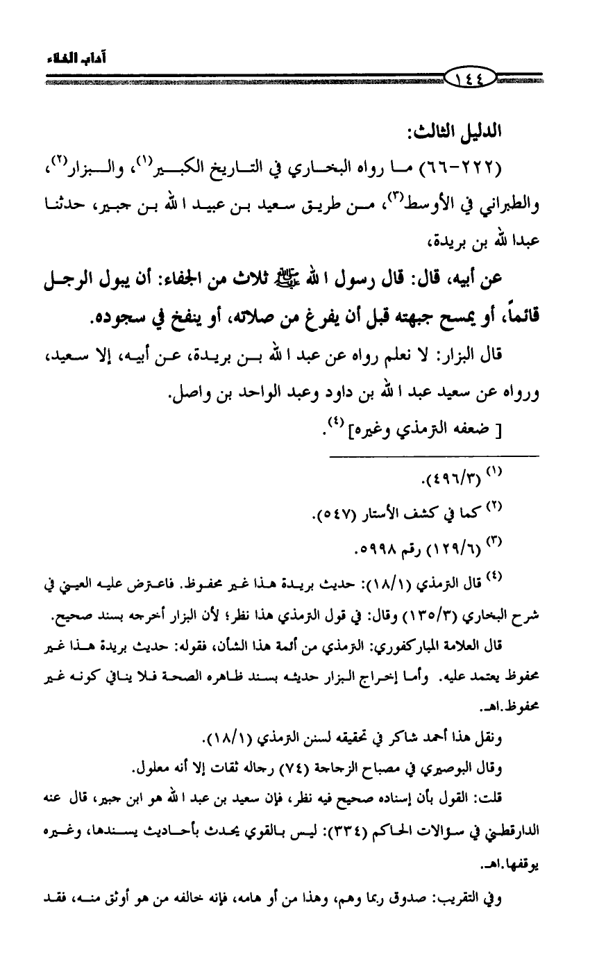 (¬٤) قال الترمذي (١/ ١٨): حديث بريدة هذا غير محفوظ. فاعترض عليه العيني في شرح البخاري (٣/ ١٣٥) وقال: في قول الترمذي هذا نظر؛ لأن البزار أخرجه بسند صحيح.