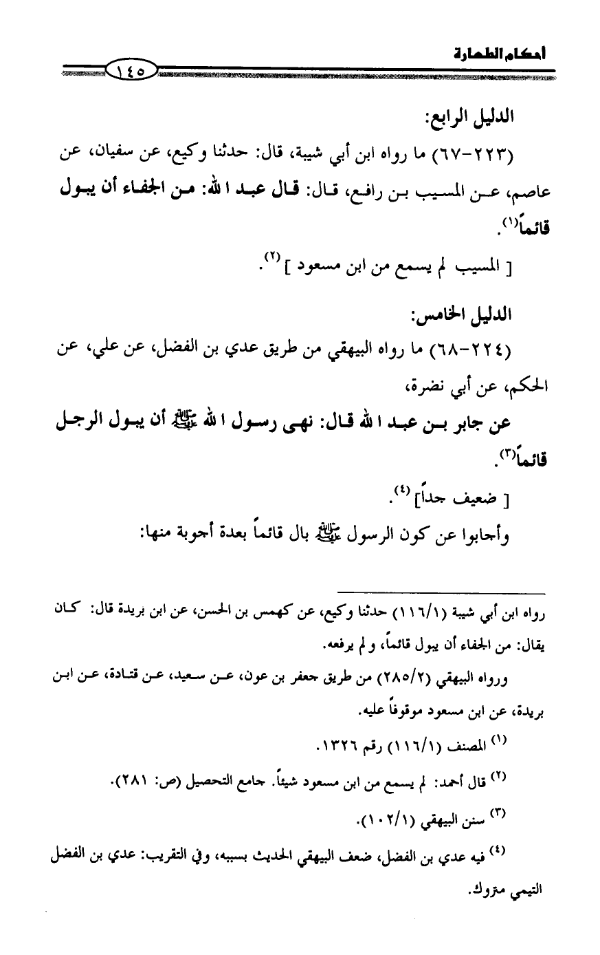 (٢٢٣ - ٦٧) ما رواه ابن أبي شيبة، قال: حدثنا وكيع، عن سفيان، عن عاصم، عن المسيب بن رافع، قال: قال عبد الله: من الجفاء أن يبول قائماً (¬١).