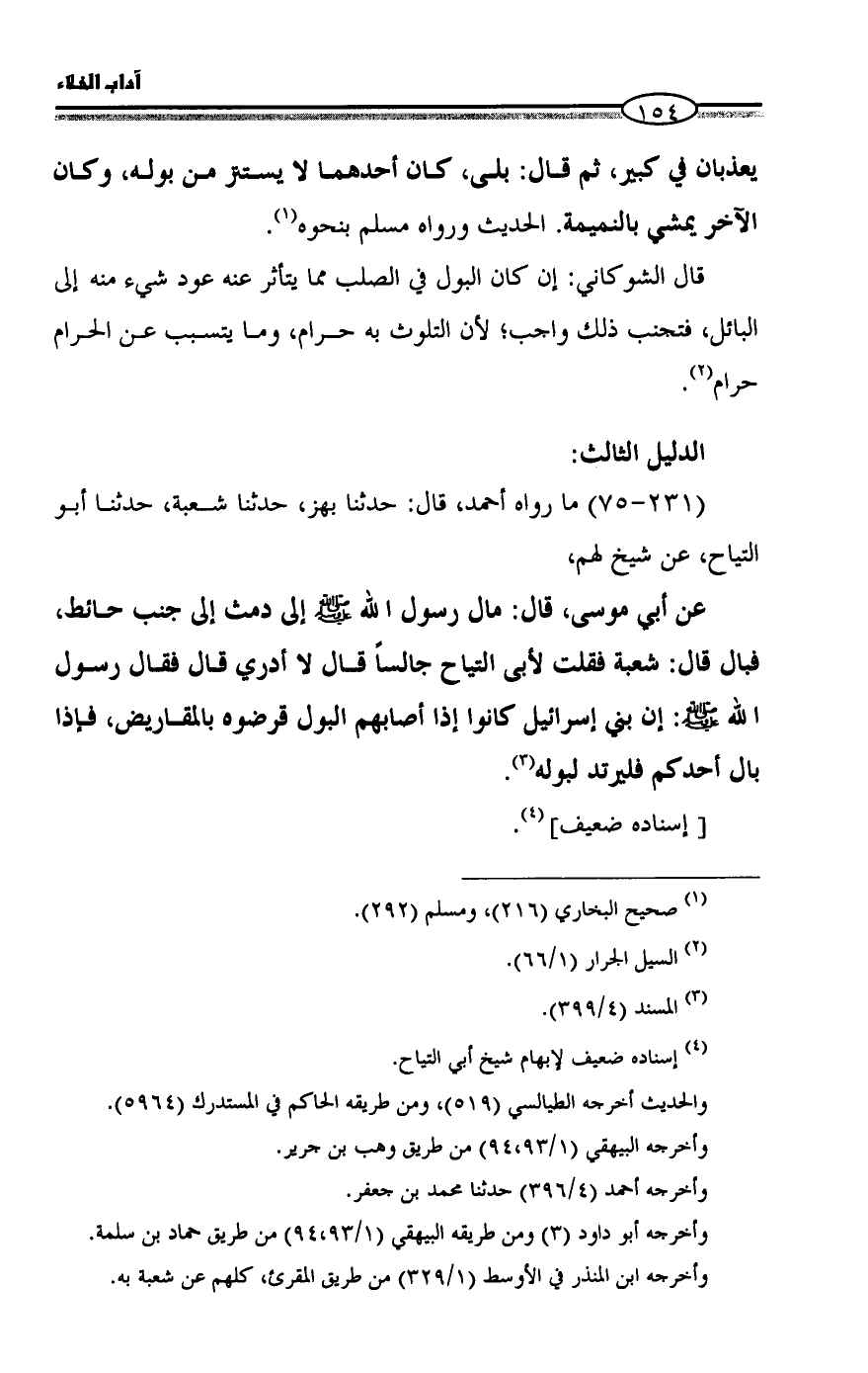 عن أبي موسى، قال: مال رسول الله - صلى الله عليه وسلم - إلى دمث إلى جنب حائط، فبال قال: شعبة فقلت لأبى التياح جالساً قال لا أدري قال فقال رسول الله - صلى الله عليه وسلم -: إن بني إسرائيل كانوا إذا أصابهم البول قرضوه بالمقاريض، فإذا بال أحدكم فليرتد لبوله (¬٣).