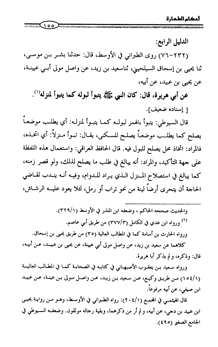 عن أبي هريرة، قال: كان النبي - صلى الله عليه وسلم - يتبوأ لبوله كما يتبوأ لمنزله (¬١).