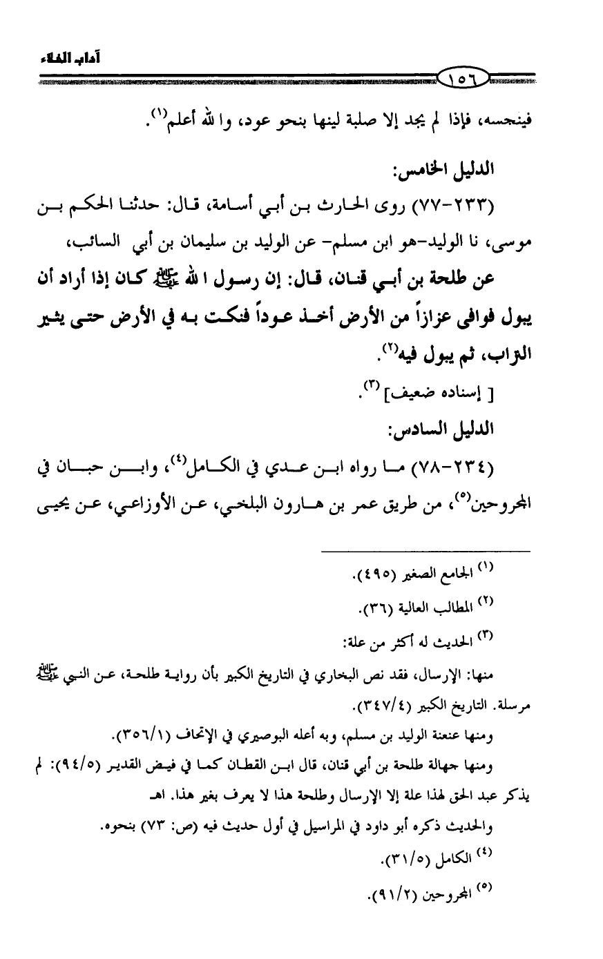 منها: الإرسال، فقد نص البخاري في التاريخ الكبير بأن رواية طلحة، عن النبي - صلى الله عليه وسلم - مرسلة. التاريخ الكبير (٤/ ٣٤٧).