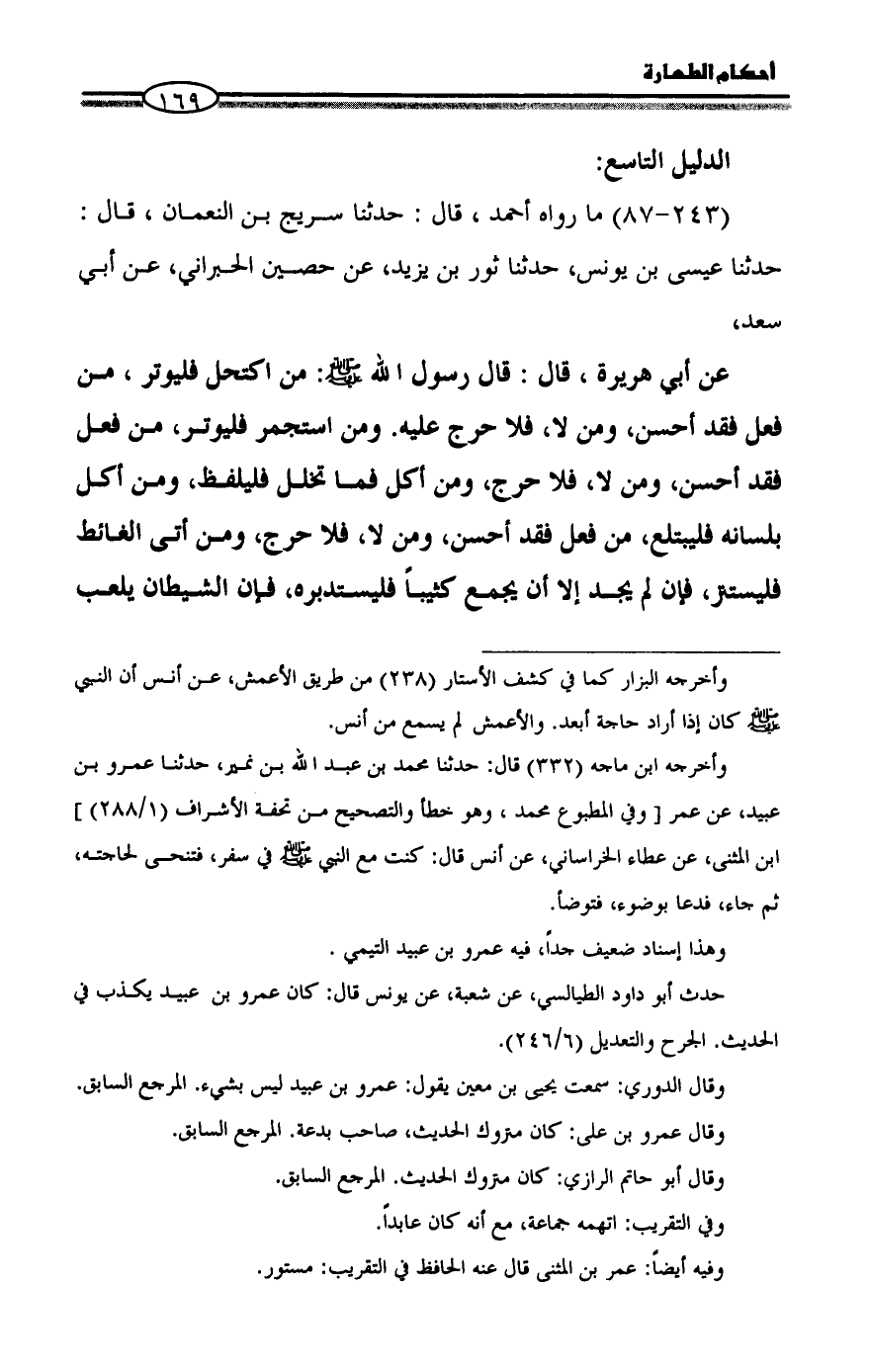عن أبي هريرة، قال: قال رسول الله - صلى الله عليه وسلم -: من اكتحل فليوتر، من فعل فقد أحسن، ومن لا، فلا حرج عليه. ومن استجمر فليوتر، من فعل فقد أحسن، ومن لا، فلا حرج، ومن أكل فما تخلل فليلفظ، ومن أكل بلسانه فليبتلع، من فعل فقد أحسن، ومن لا، فلا حرج، ومن أتى الغائط فليستتر، فإن لم يجد إلا أن يجمع كثيباً فليستدبره، فإن الشيطان يلعب