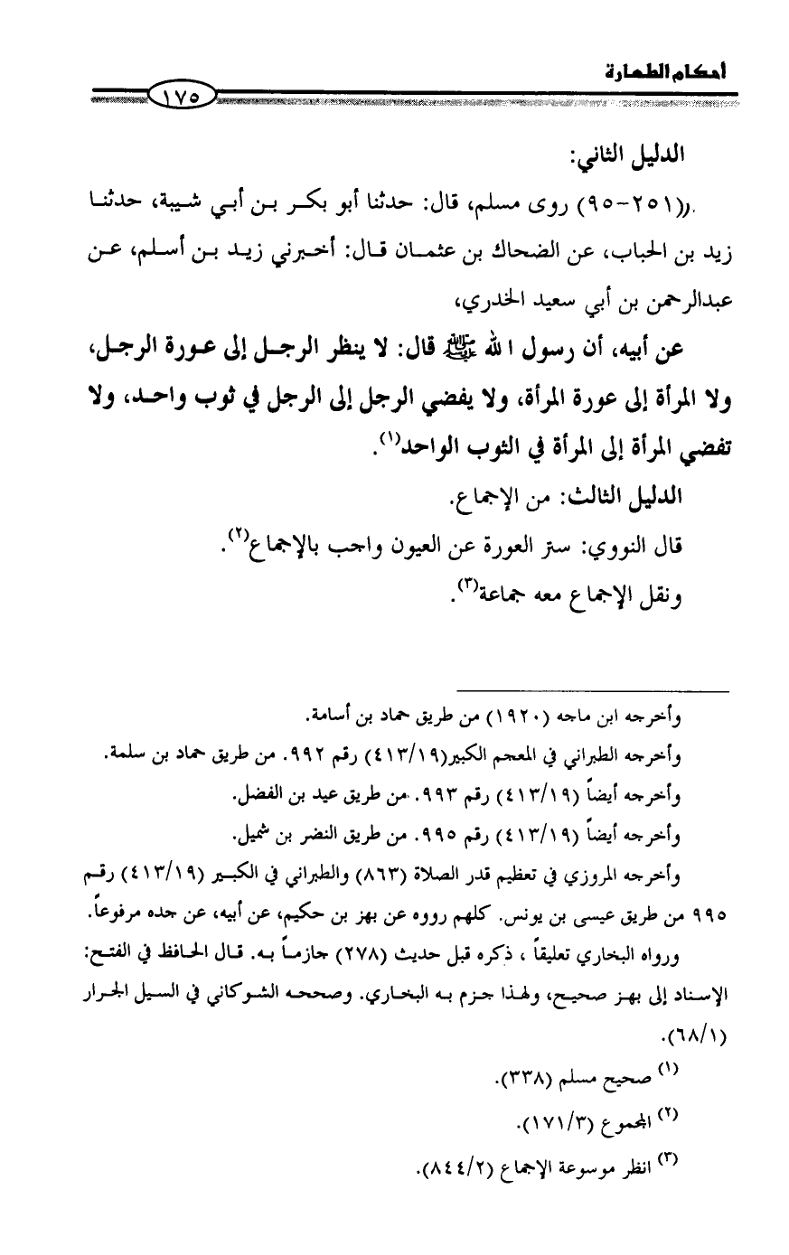 (٢٥١ - ٩٥) روى مسلم، قال: حدثنا أبو بكر بن أبي شيبة، حدثنا زيد بن الحباب، عن الضحاك بن عثمان قال: أخبرني زيد بن أسلم، عن عبد الرحمن بن أبي سعيد الخدري،