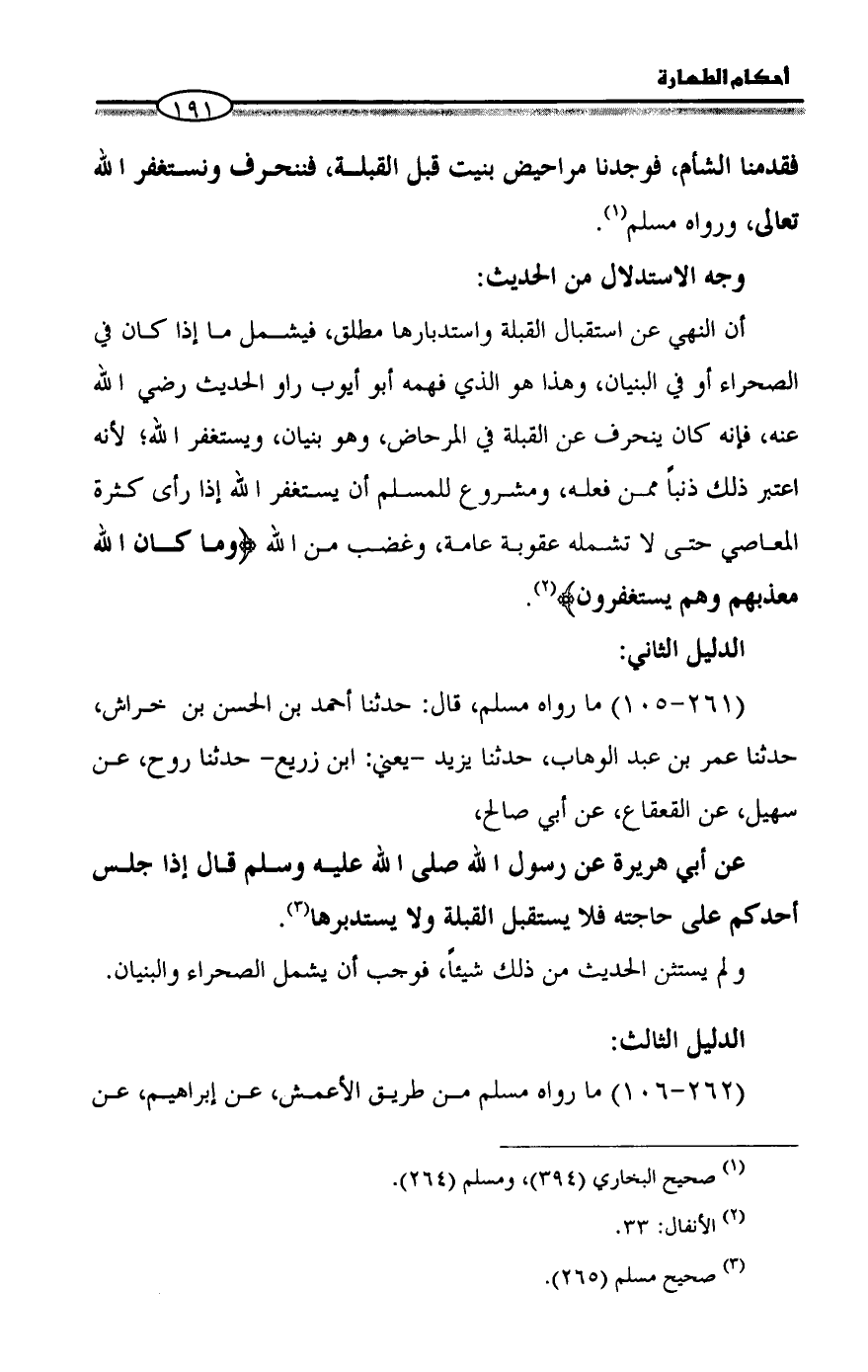 فقدمنا الشأم، فوجدنا مراحيض بنيت قبل القبلة، فننحرف ونستغفر الله تعالى، ورواه مسلم (¬١).