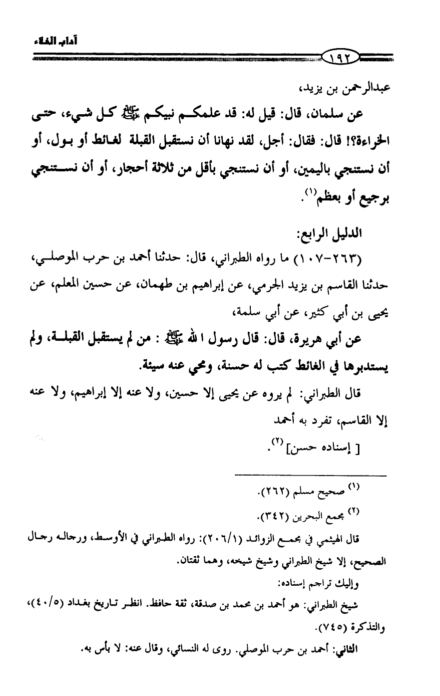 عن أبي هريرة، قال: قال رسول الله - صلى الله عليه وسلم -: من لم يستقبل القبلة، ولم يستدبرها في الغائط كتب له حسنة، ومحي عنه سيئة.
