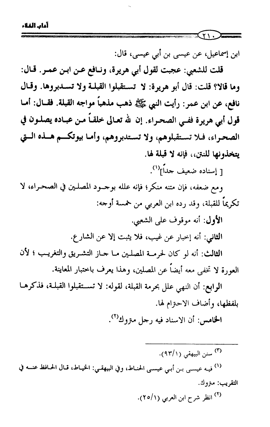 قلت للشعبي: عجبت لقول أبي هريرة، ونافع عن ابن عمر. قال: وما قالا؟ قلت: قال أبو هريرة: لا تستقبلوا القبلة ولا تسدبروها. وقال نافع، عن ابن عمر: رأيت النبي - صلى الله عليه وسلم - ذهب مذهباً مواجه القبلة. فقال: أما قول أبي هريرة ففي الصحراء. إن لله تعالى خلقاً من عباده يصلون في الصحراء، فلا تستقبلوهم، ولا تستدبروهم، وأما بيوتكم هذه التي يتخذونها للنتن،، فإنه لا قبلة لها.