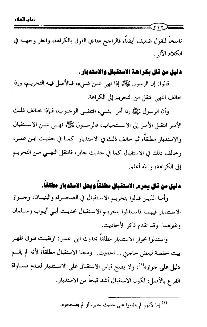 وأن الرسول - صلى الله عليه وسلم - إذا أمر بشيء اقتضى الوجوب، فإذا خالف ذلك الأمر انتقل الأمر إلى الاستحباب، فالرسول - صلى الله عليه وسلم - نهى عن الاستقبال والاستدبار مطلقاً، ثم خالف ذلك في الاستدبار كما في حديث ابن عمر، وخالف ذلك في الاستقبال كما في حديث جابر، فانتقل النهي من التحريم إلى الكراهة، والله أعلم.