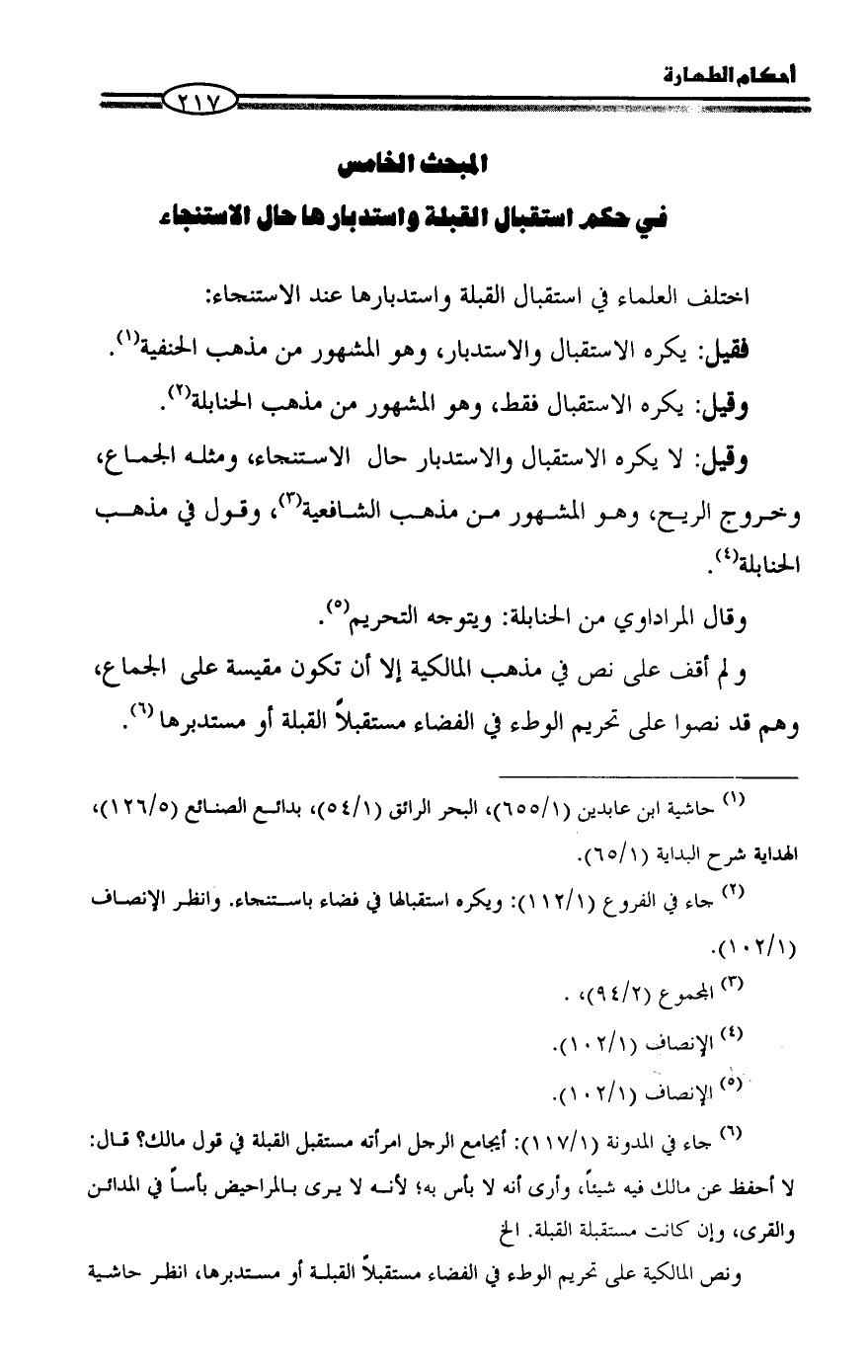 المبحث الخامس في حكم استقبال القبلة واستدبارها حال الاستنجاء