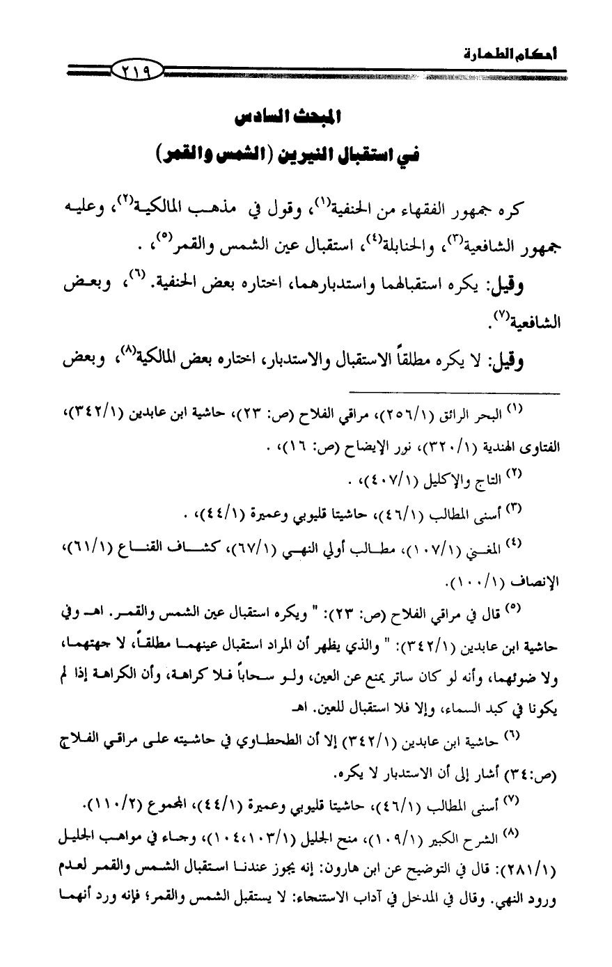 (¬٨) الشرح الكبير (١/ ١٠٩)، منح الجليل (١/ ١٠٣، ١٠٤)، وجاء في مواهب الجليل (١/ ٢٨١): قال في التوضيح عن ابن هارون: إنه يجوز عندنا استقبال الشمس والقمر لعدم ورود النهي. وقال في المدخل في آداب الاستنجاء: لا يستقبل الشمس والقمر؛ فإنه ورد أنهما =