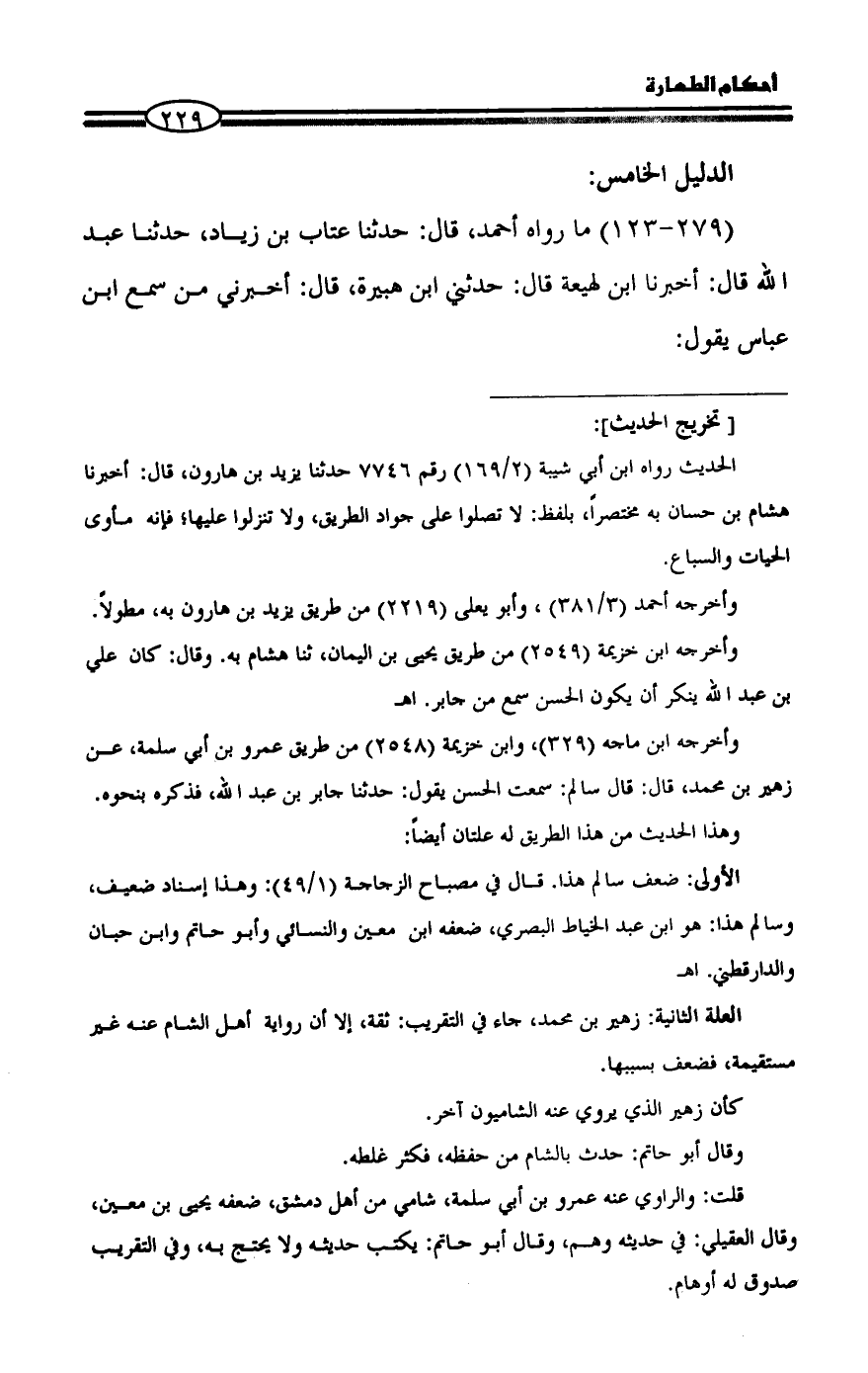 (٢٧٩ - ١٢٣) ما رواه أحمد، قال: حدثنا عتاب بن زياد، حدثنا عبد الله قال: أخبرنا ابن لهيعة قال: حدثني ابن هبيرة، قال: أخبرني من سمع ابن عباس يقول: