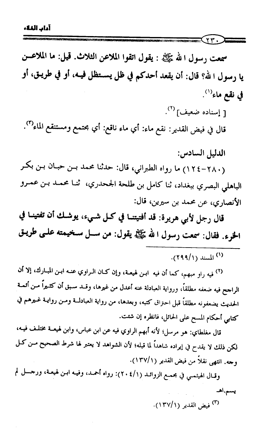 (¬٢) فيه راو مبهم، كما أن فيه ابن لهيعة، وإن كان الراوي عنه ابن المبارك، إلا أن الراجح فيه ضعفه مطلقاً، ورواية العبادلة عنه أعدل من غيرها، وقد سبق أن كثيراً من أئمة الحديث يضعفونه مطلقاً قبل احتراق كتبه، وبعدها، من رواية العبادلة ومن رواية غيرهم في كتابي أحكام المسح على الحائل، فانظره إن شئت.