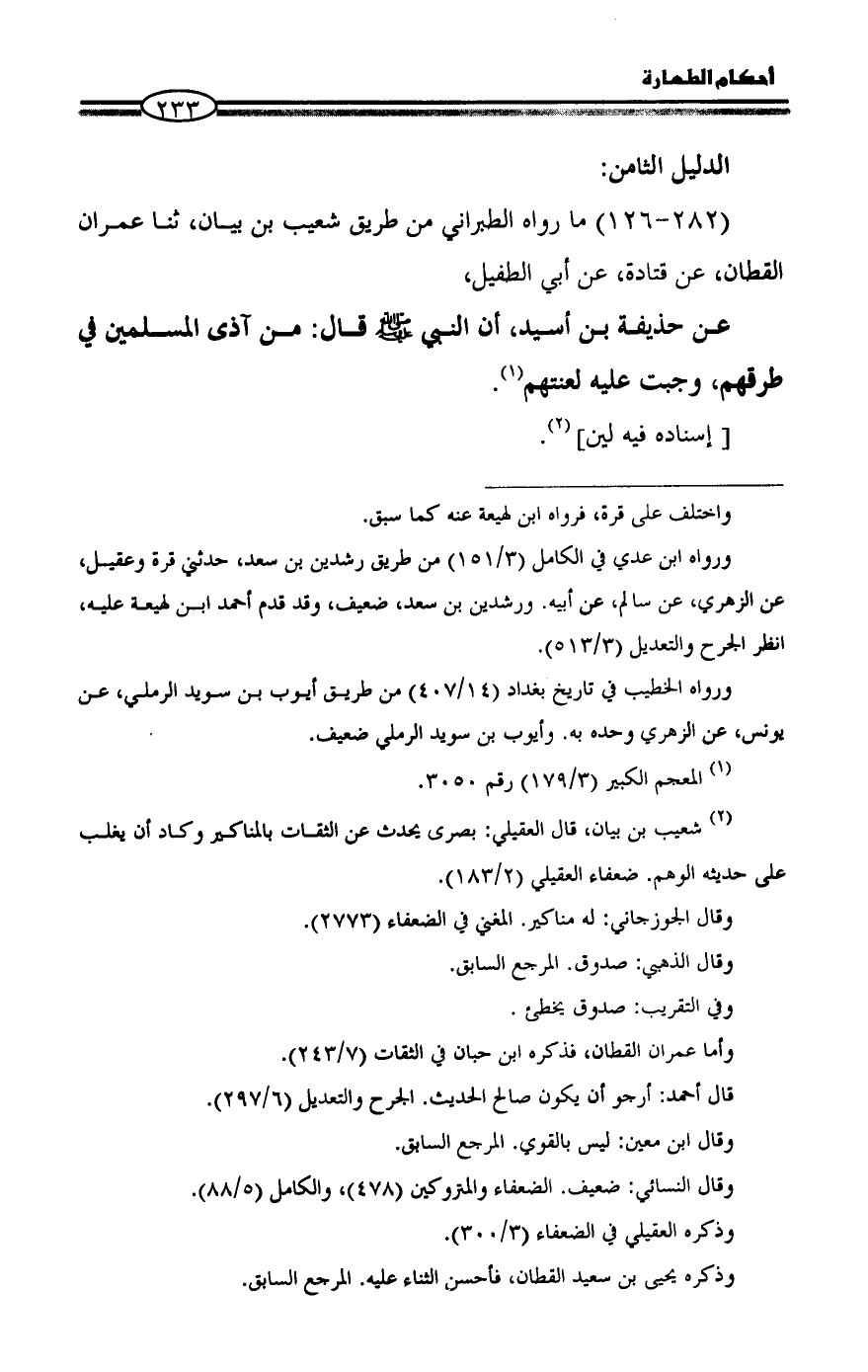 عن حذيفة بن أسيد، أن النبي - صلى الله عليه وسلم - قال: من آذى المسلمين في طرقهم، وجبت عليه لعنتهم (¬١).
