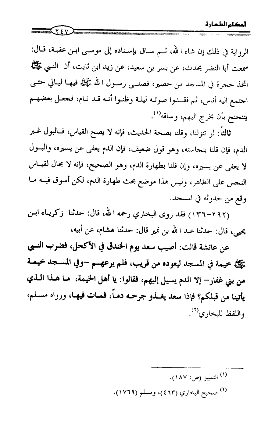 ثالثاً: لو تنزلنا، وقلنا بصحة الحديث، فإنه لا يصح القياس، فالبول غير الدم، فإن قلنا بنجاسته، وهو قول ضعيف، فإن الدم يعفى عن يسيره، والبول لا يعفى عن يسيره، وإن قلنا بطهارة الدم، وهو الصحيح، فإنه لا مجال لقياس النجس على الطاهر، وليس هذا موضع بحث طهارة الدم، لكن أسوق فيه ما وقع من حدوثه في المسجد.