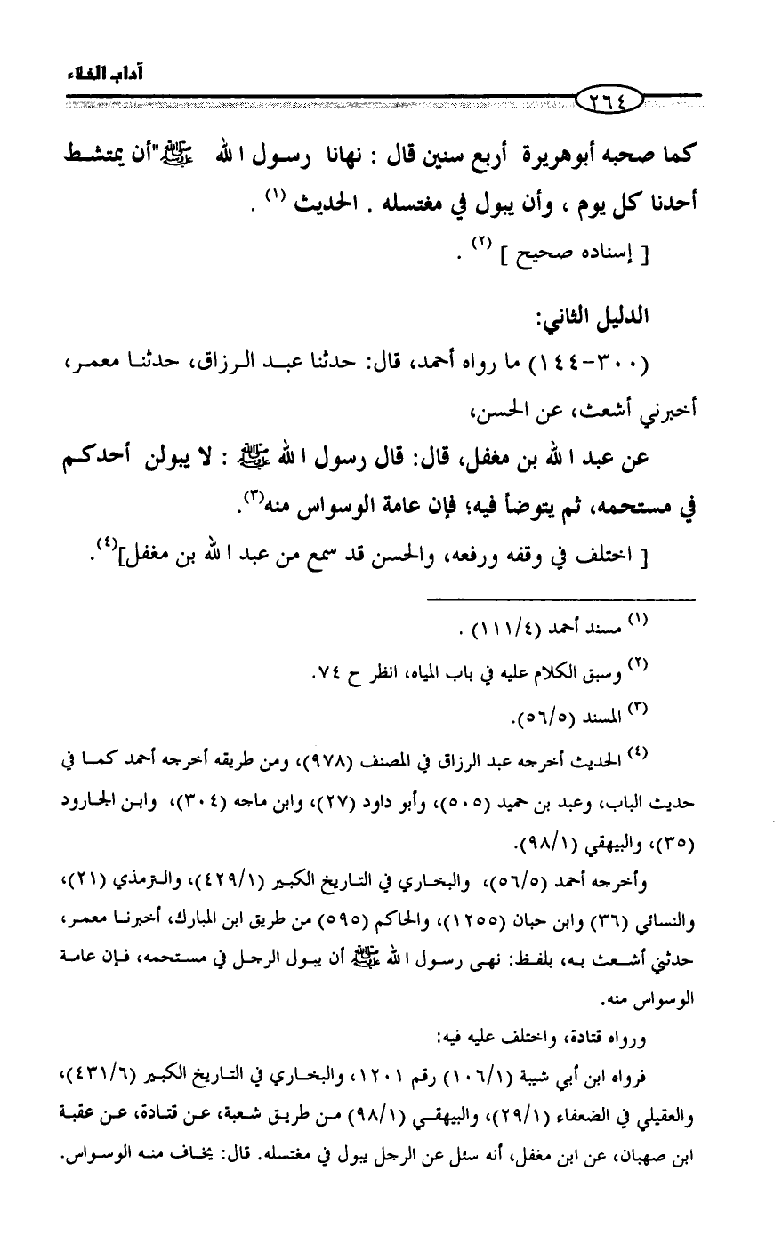عن عبد الله بن مغفل، قال: قال رسول الله - صلى الله عليه وسلم -: لا يبولن أحدكم في مستحمه، ثم يتوضأ فيه؛ فإن عامة الوسواس منه (¬٣).