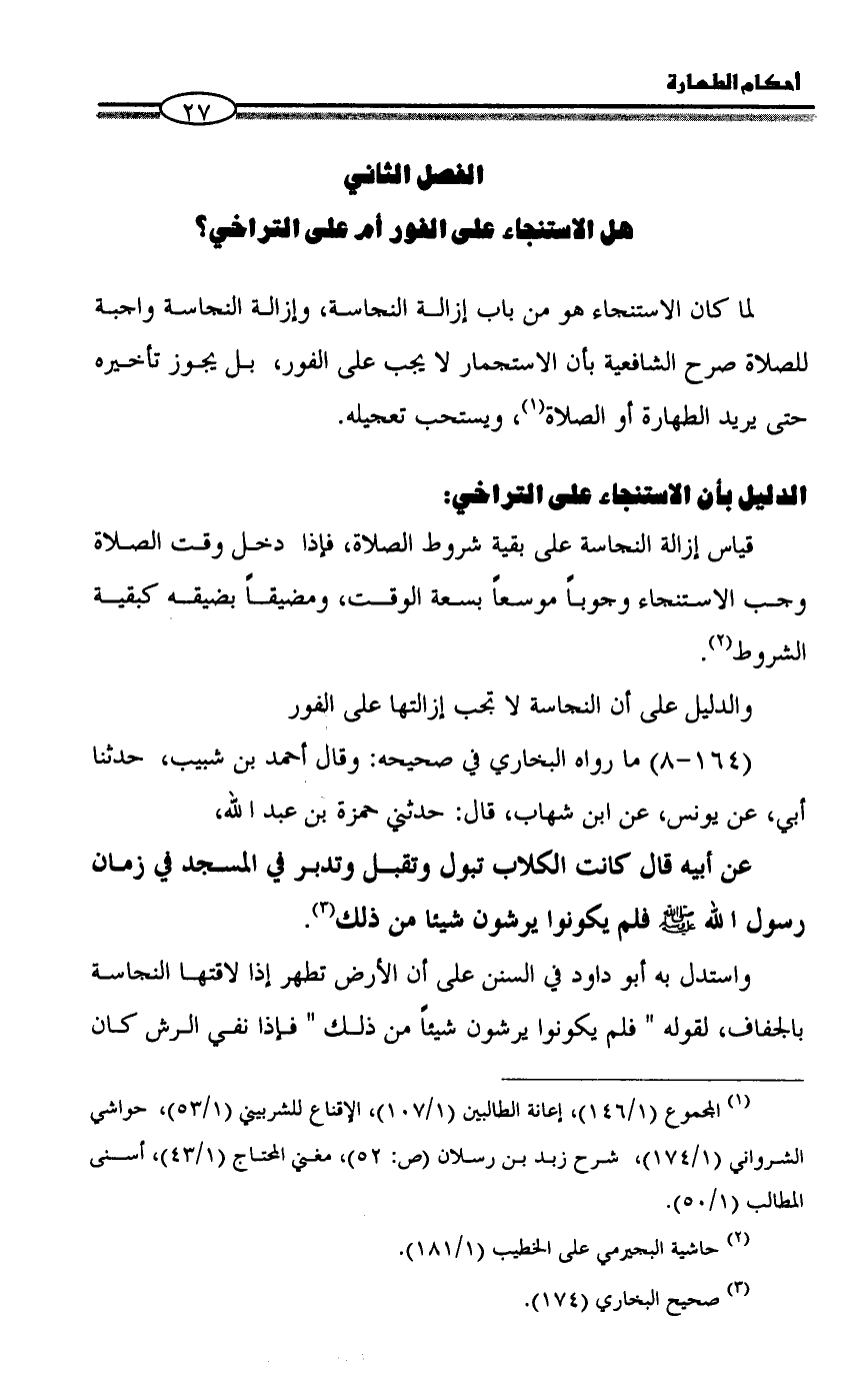 الفصل الثاني هل الاستنجاء على الفور أم على التراخي؟