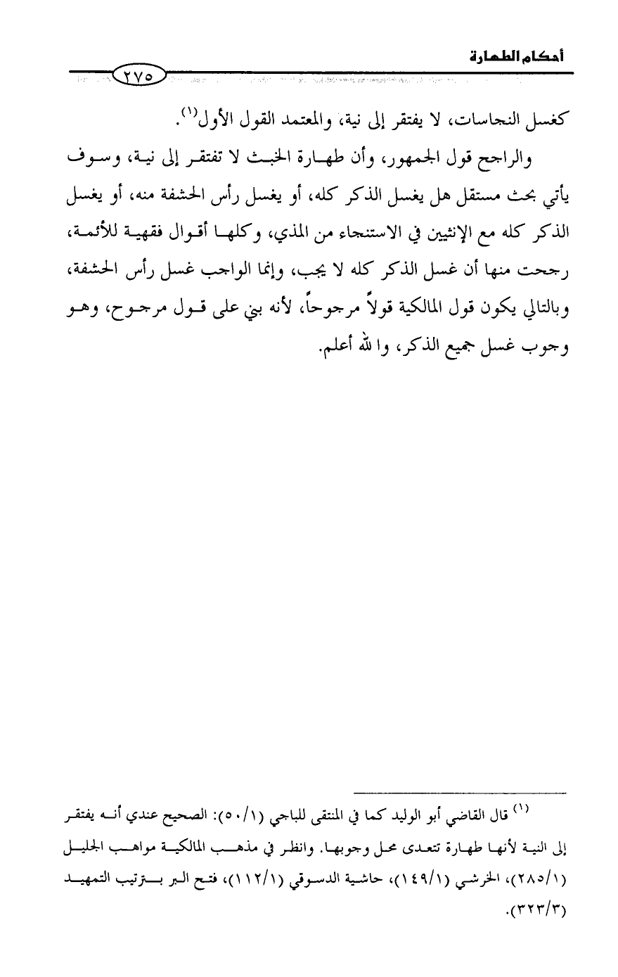 (¬١) قال القاضي أبو الوليد كما في المنتقى للباجي (١/ ٥٠): الصحيح عندي أنه يفتقر إلى النية لأنها طهارة تتعدى محل وجوبها. وانظر في مذهب المالكية مواهب الجليل (١/ ٢٨٥)، الخرشي (١/ ١٤٩)، حاشية الدسوقي (١/ ١١٢)، فتح البر بترتيب التمهيد (٣/ ٣٢٣).