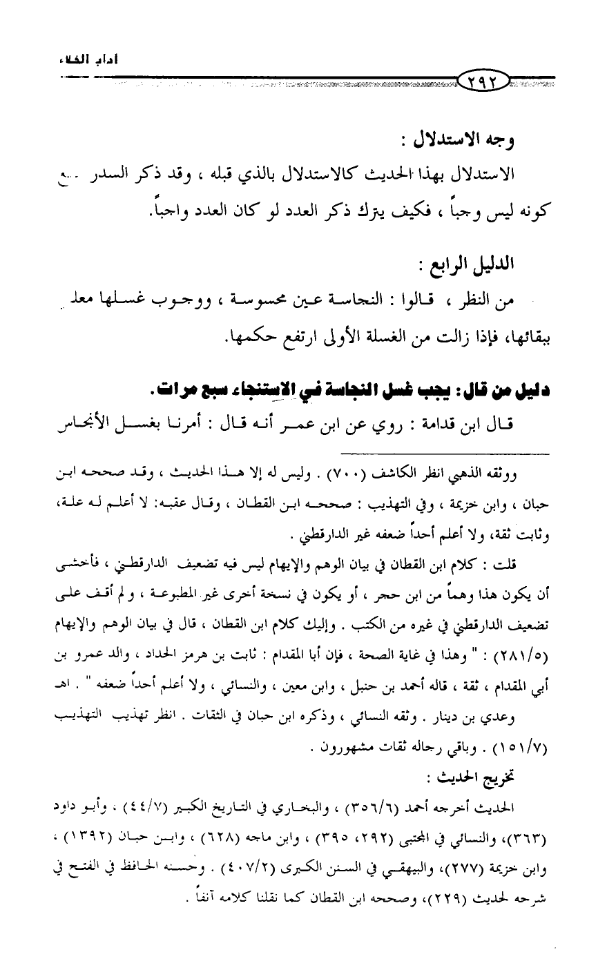 دليل من قال: يجب غسل النجاسة في الاستنجاء سبع مرات.