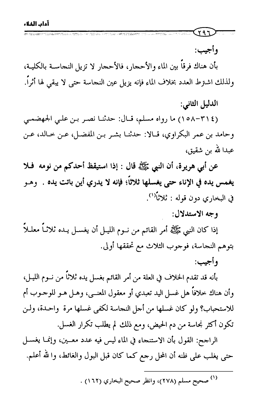 بأنه قد تقدم الخلاف في العلة من أمر القائم بغسل يده ثلاثاً من نوم الليل، وأن هناك خلافاً هل غسل اليد تعبدي أو معقول المعنى، وهل هو للوجوب أم للاستحباب؟ ولو كان غسلها من أجل النجاسة لكفى غسلها مرة واحدة، ولن تكون أكثر نجاسة من دم الحيض، ومع ذلك لم يطلب تكرار الغسل.