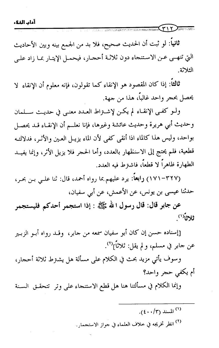 وسوف يأتي مزيد بحث في الكلام على مسألة هل يشترط ثلاثة أحجار، أم يكفي حجر واحد؟