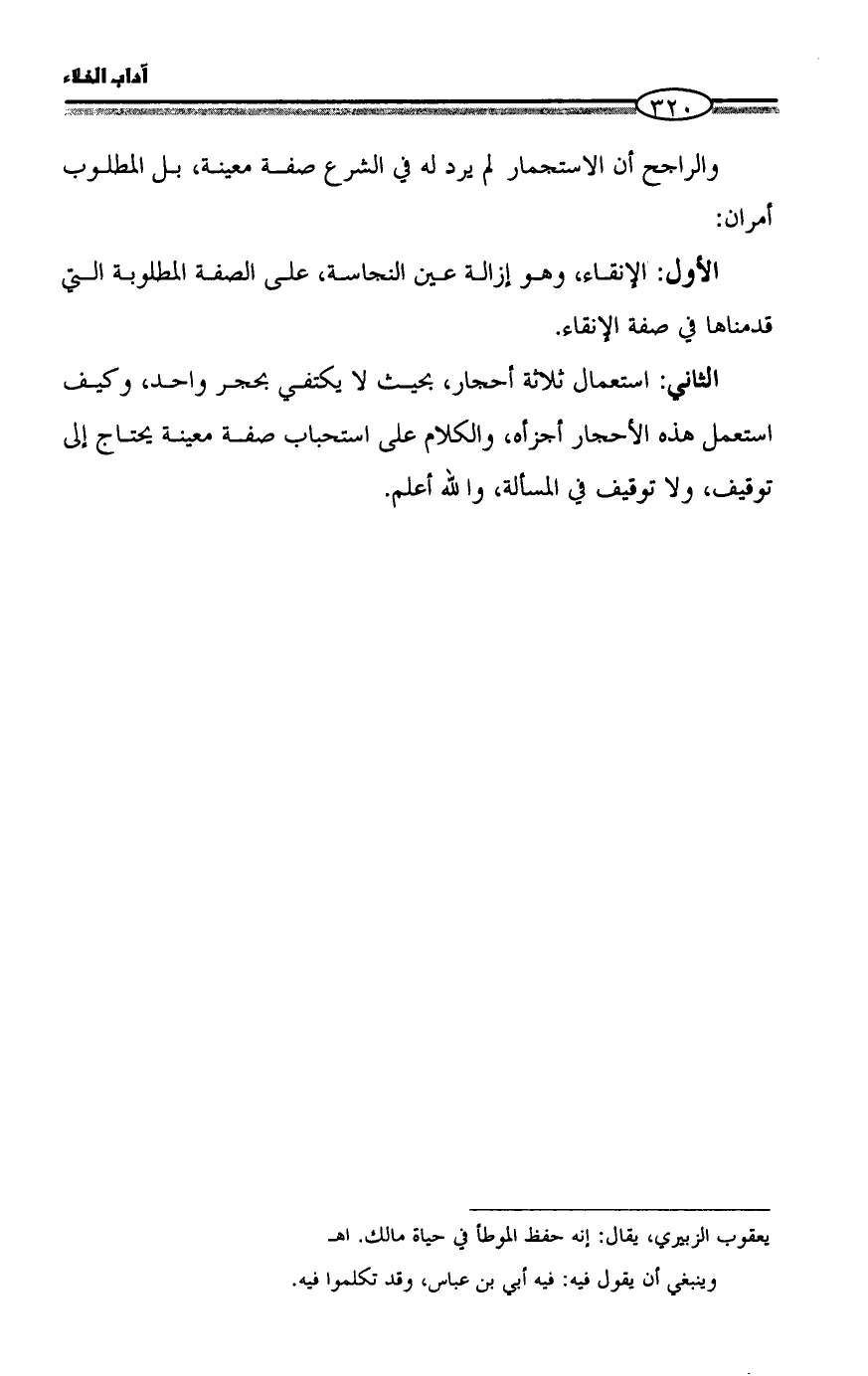 الثاني: استعمال ثلاثة أحجار، بحيث لا يكتفي بحجر واحد، وكيف استعمل هذه الأحجار أجزأه، والكلام على استحباب صفة معينة يحتاج إلى توقيف، ولا توقيف في المسألة، والله أعلم.