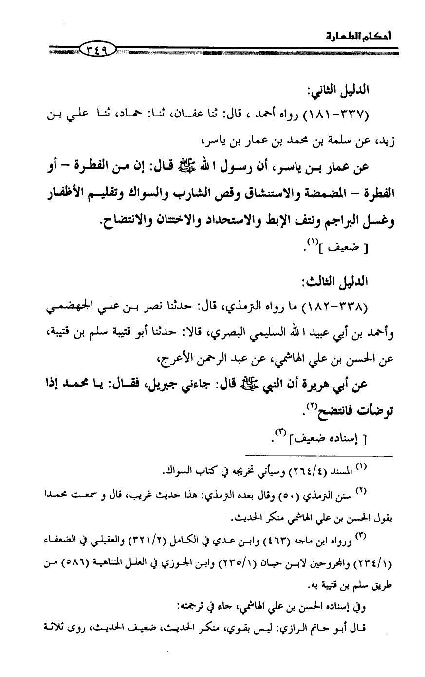 عن عمار بن ياسر، أن رسول الله - صلى الله عليه وسلم - قال: إن من الفطرة - أو الفطرة - المضمضة والاستنشاق وقص الشارب والسواك وتقليم الأظفار وغسل البراجم ونتف الإبط والاستحداد والاختتان والانتضاح.