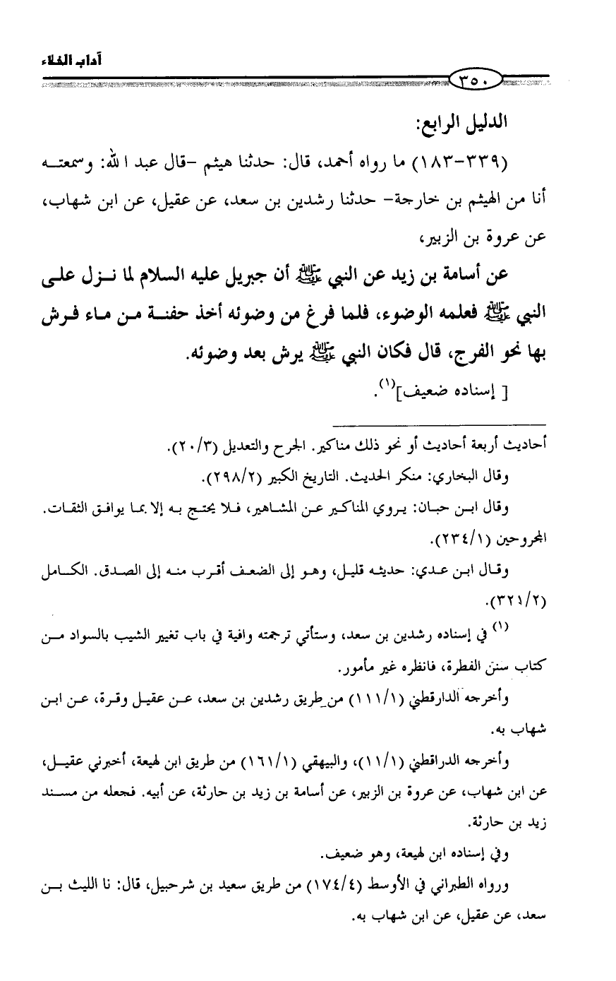 (٣٣٩ - ١٨٣) ما رواه أحمد، قال: حدثنا هيثم -قال عبد الله: وسمعته أنا من الهيثم بن خارجة- حدثنا رشدين بن سعد، عن عقيل، عن ابن شهاب، عن عروة بن الزبير،