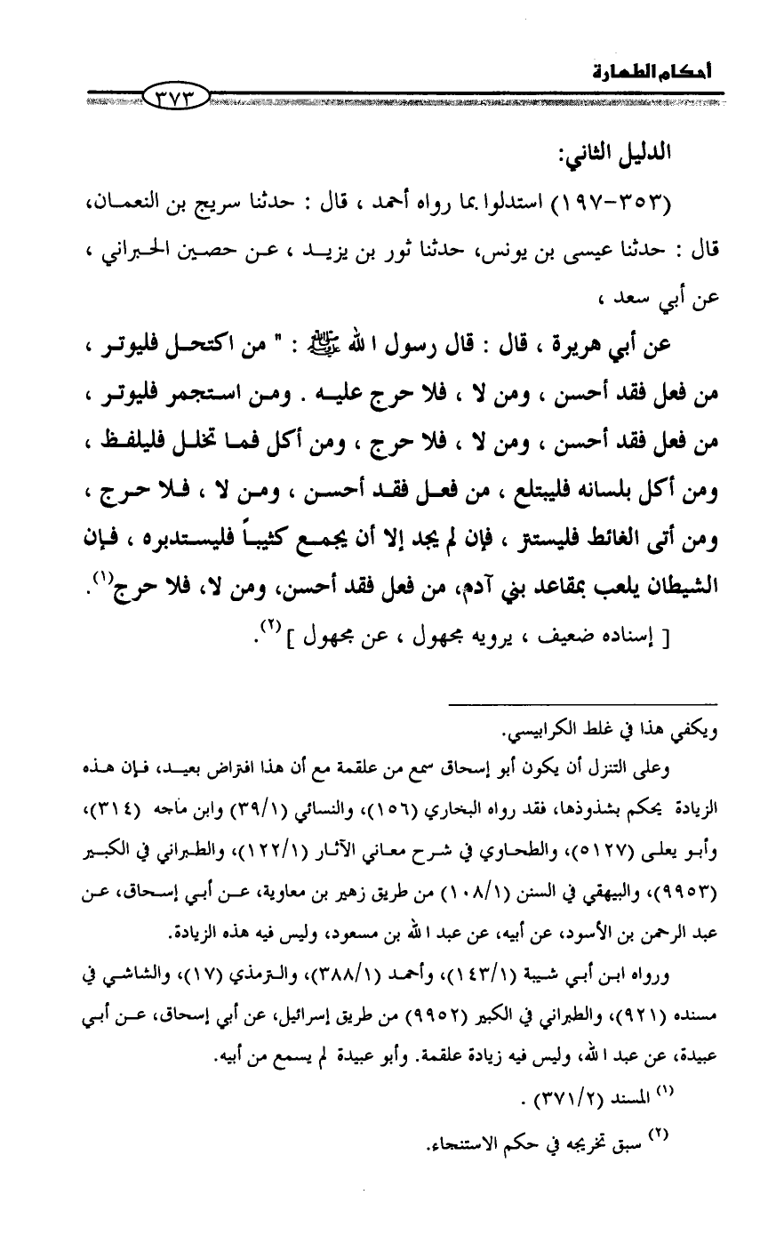 (٣٥٢ - ١٩٦) استدلوا بما رواه أحمد، قال: حدثنا سريج بن النعمان، قال: حدثنا عيسى بن يونس، حدثنا ثور بن يزيد، عن حصين الحبراني، عن أبي سعد،