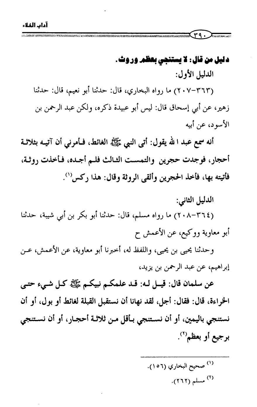 أنه سمع عبد الله يقول: أتى النبي - صلى الله عليه وسلم - الغائط، فأمرني أن آتيه بثلاثة أحجار، فوجدت حجرين والتمست الثالث فلم أجده، فأخذت روثة، فأتيته بها، فأخذ الحجرين وألقى الروثة وقال: هذا ركس (¬١).