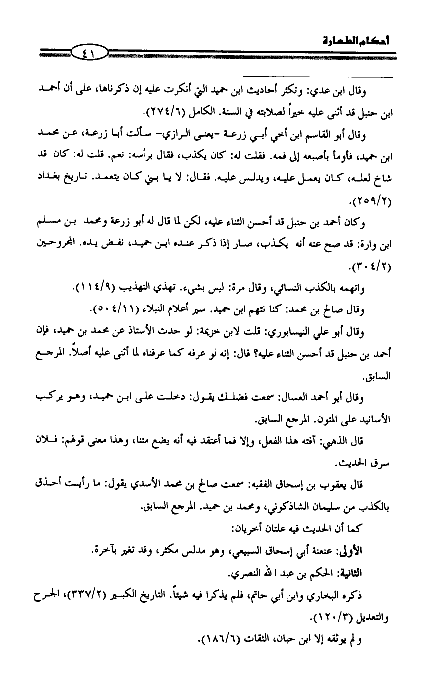 = وقال ابن عدي: وتكثر أحاديث ابن حميد التي أنكرت عليه إن ذكرناها، على أن أحمد ابن حنبل قد أثنى عليه خيراً لصلابته في السنة. الكامل (٦/ ٢٧٤).