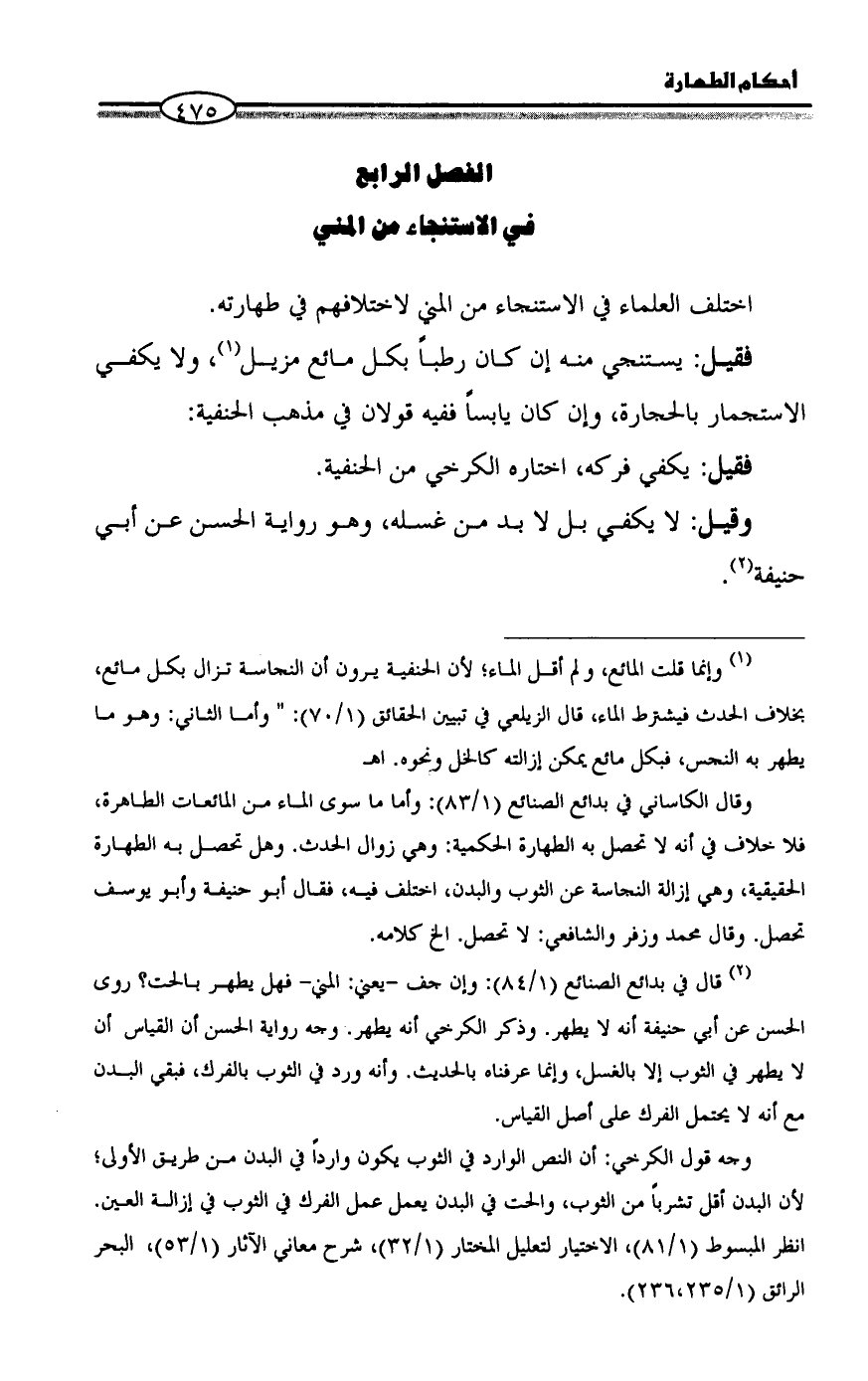 (¬٢) قال في بدائع الصنائع (١/ ٨٤): وإن جف -يعني: المني- فهل يطهر بالحت؟ روى الحسن عن أبي حنيفة أنه لا يطهر. وذكر الكرخي أنه يطهر. وجه رواية الحسن أن القياس أن لا يطهر في الثوب إلا بالغسل، وإنما عرفناه بالحديث. وأنه ورد في الثوب بالفرك، فبقي البدن مع أنه لا يحتمل الفرك على أصل القياس.