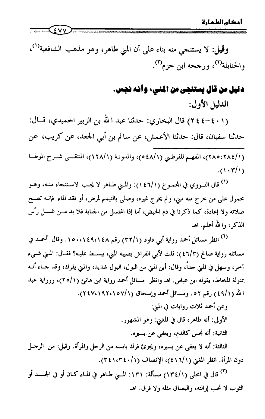 (¬٣) قال في المحلى (١/ ١٣٤) مسألة: ١٣١: المني طاهر في الماء كان أو في الجسد أو الثوب لا تجب إزالته، والبصاق مثله ولا فرق. اهـ