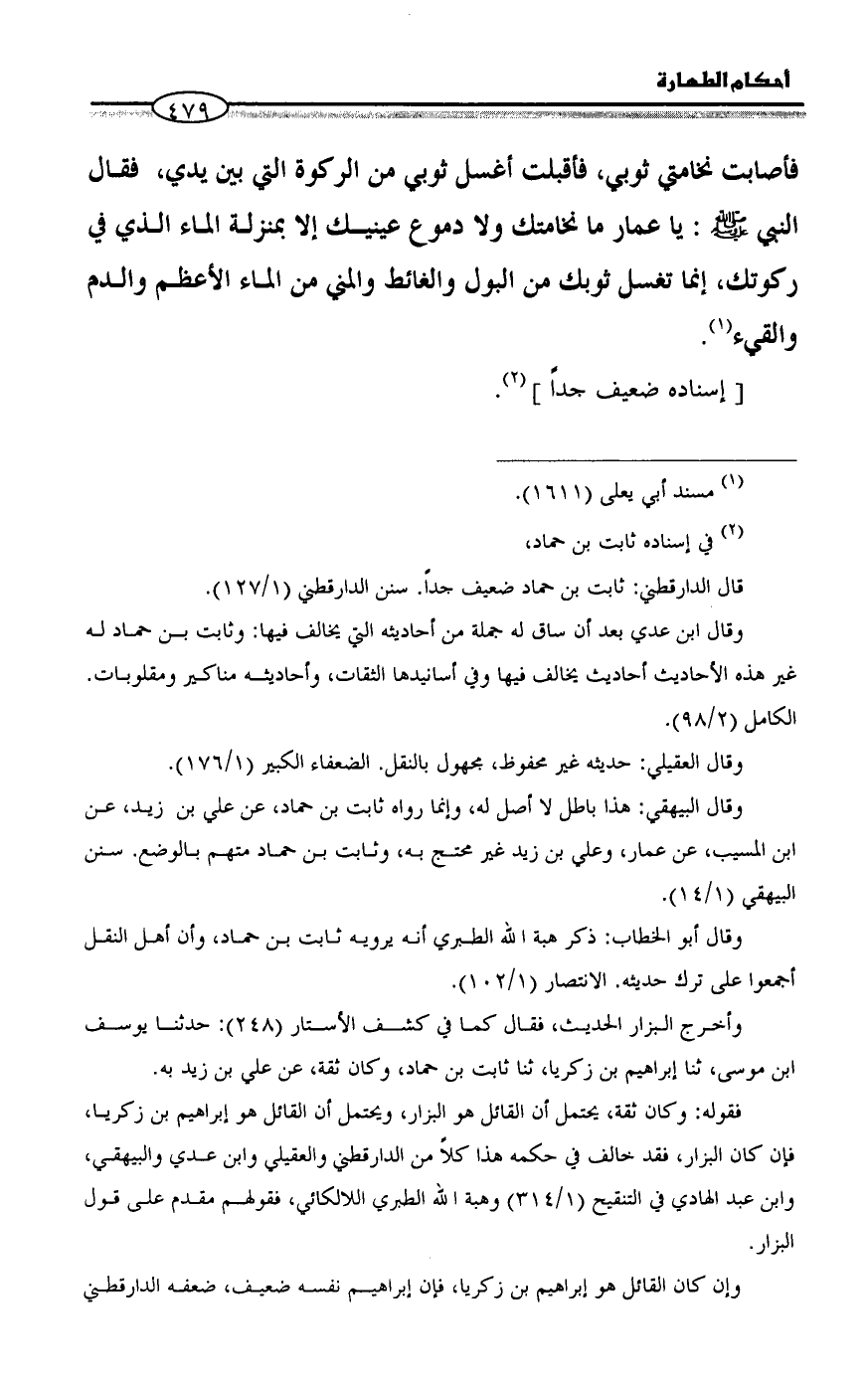 وقال البيهقي: هذا باطل لا أصل له، وإنما رواه ثابت بن حماد، عن علي بن زيد، عن ابن المسيب، عن عمار، وعلي بن زيد غير محتج به، وثابت بن حماد متهم بالوضع. سنن البيهقي (١/ ١٤).
