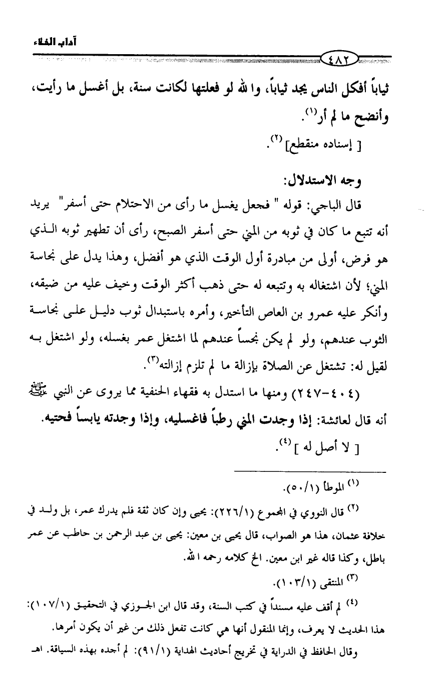 (٤٠٢ - ٢٤٦) ومنها ما استدل به فقهاء الحنفية مما يروى عن النبي - صلى الله عليه وسلم - أنه قال لعائشة: إذا وجدت المني رطباً فاغسليه، وإذا وجدته يابساً فحتيه.