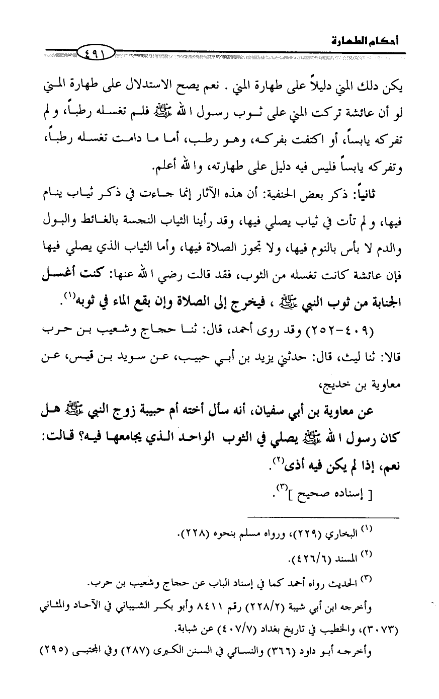 ثانياً: ذكر بعض الحنفية: أن هذه الآثار إنما جاءت في ذكر ثياب ينام فيها، ولم تأت في ثياب يصلي فيها، وقد رأينا الثياب النجسة بالغائط والبول والدم لا بأس بالنوم فيها، ولا تجوز الصلاة فيها، وأما الثياب الذي يصلي فيها فإن عائشة كانت تغسله من الثوب، فقد قالت رضي الله عنها: كنت أغسل الجنابة من ثوب النبي - صلى الله عليه وسلم -، فيخرج إلى الصلاة وإن بقع الماء في ثوبه (¬١).