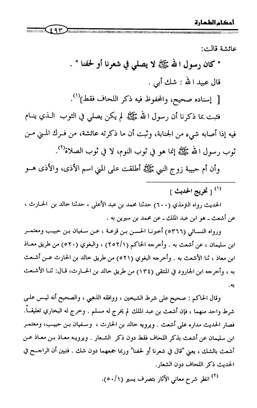 وقال الحاكم: صحيح على شرط الشيخين، ووافقه الذهبي، والصحيح أنه ليس على شرط واحد منهما، فإن أشعث بن عبد الملك لم يخرج له مسلم. وخرج له البخاري تعليقاً. فصار الحديث مداره على أشعث. ويرويه خالد بن الحارث، وسفيان بن حبيب، ومعتمر بن سليمان عن أشعث بذكر اللحاف فقط دون ذكر الشعار. ويرويه معاذ بن معاذ عن أشعث بالشك، يعني "قال في شعرنا أو لحفنا" وربما جمعهما دون شك. فتبين أن الراجح في الحديث ذكر اللحاف دون الشعار.