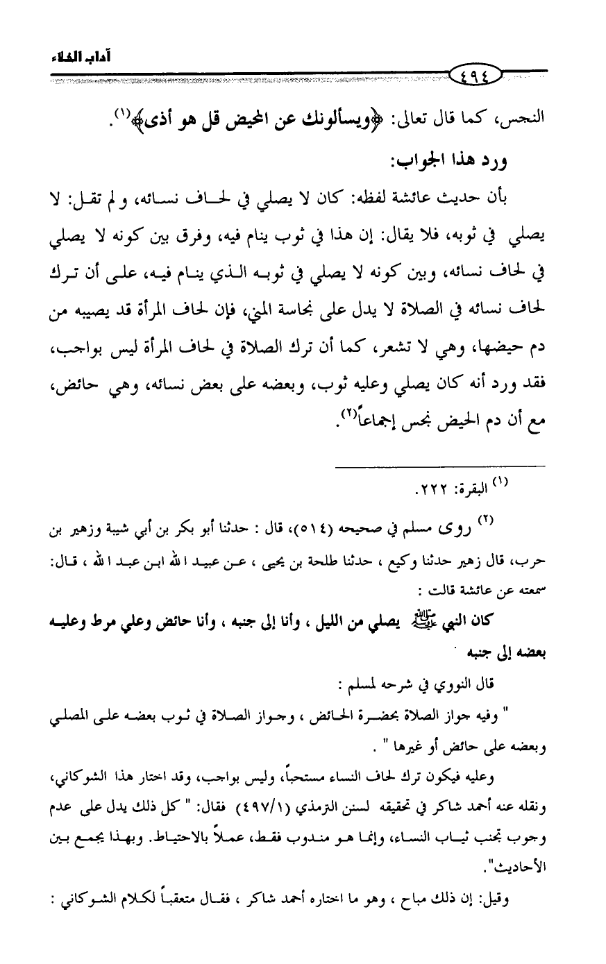 بأن حديث عائشة لفظه: كان لا يصلي في لحاف نسائه، ولم تقل: لا يصلي في ثوبه، فلا يقال: إن هذا في ثوب ينام فيه، وفرق بين كونه لا يصلي في لحاف نسائه، وبين كونه لا يصلي في ثوبه الذي ينام فيه، على أن ترك لحاف نسائه في الصلاة لا يدل على نجاسة المني، فإن لحاف المرأة قد يصيبه من دم حيضها، وهي لا تشعر، كما أن ترك الصلاة في لحاف المرأة ليس بواجب، فقد ورد أنه كان يصلي وعليه ثوب، وبعضه على بعض نسائه، وهي حائض، مع أن دم الحيض نجس إجماعاً (¬٢).