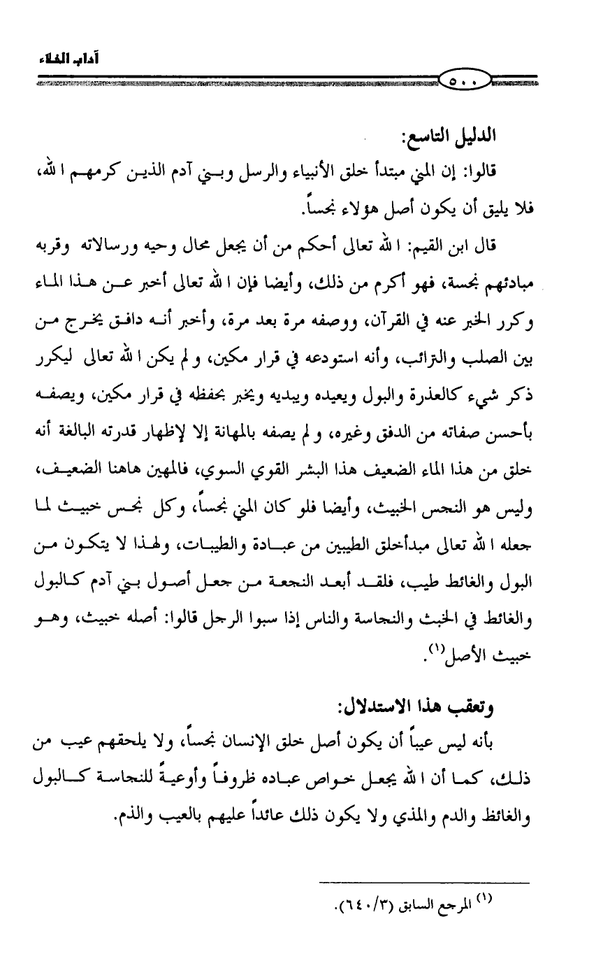 قال ابن القيم: الله تعالى أحكم من أن يجعل محال وحيه ورسالاته وقربه مبادئهم نجسة، فهو أكرم من ذلك، وأيضا فإن الله تعالى أخبر عن هذا الماء وكرر الخبر عنه في القرآن، ووصفه مرة بعد مرة، وأخبر أنه دافق يخرج من بين الصلب والترائب، وأنه استودعه في قرار مكين، ولم يكن الله تعالى ليكرر ذكر شيء كالعذرة والبول ويعيده ويبديه ويخبر بحفظه في قرار مكين، ويصفه بأحسن صفاته من الدفق وغيره، ولم يصفه بالمهانة إلا لإظهار قدرته البالغة أنه خلق من هذا الماء الضعيف هذا البشر القوي السوي، فالمهين هاهنا الضعيف، وليس هو النجس الخبيث، وأيضا فلو كان المني نجساً، وكل نجس خبيث لما جعله الله تعالى مبدأخلق الطيبين من عبادة والطيبات، ولهذا لا يتكون من البول والغائط طيب، فلقد أبعد النجعة من جعل أصول بني آدم كالبول والغائط في الخبث والنجاسة والناس إذا سبوا الرجل قالوا: أصله خبيث، وهو خبيث الأصل (¬١).