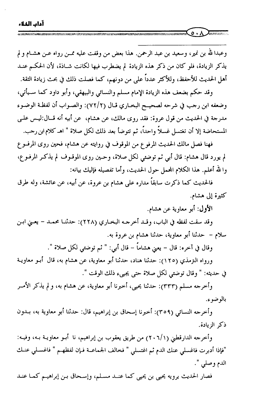 = وعبد الله بن نمير، وسعيد بن عبد الرحمن. هذا بعض من وقفت عليه ممن رواه عن هشام ولم يذكر الزيادة، فلو كان من ذكر هذه الزيادة لم يضطرب فيها لكانت شاذة، لأن الحكم عند أهل الحديث للأحفظ، وللأكثر عدداً على من دونهم، كما فصلت ذلك في بحث زيادة الثقة.