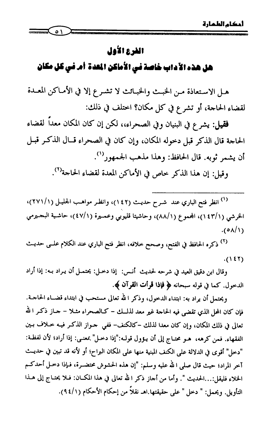 (¬١) انظر فتح الباري عند شرح حديث (١٤٢)، وانظر مواهب الجليل (١/ ٢٧١)، الخرشي (١/ ١٤٣)، المجموع (١/ ٨٨)، وحاشيتا قليوبي وعميرة (١/ ٤٧)، حاشية البجيرمي (١/ ٥٨).