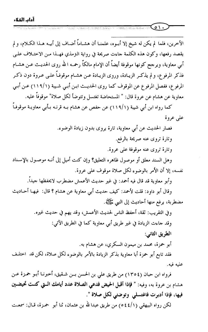 = الآخرين، فلما لم يكن له شيخ إلا أبوه، علمنا أن هشاماً أضاف إلى أبيه هذا الكلام، ولم يقصد رفعها، وكون هذه الكلمة جاءت صريحة في رواية الترمذي فهذا من الاختلاف على أبي معاوية، ويرجح كونها موقوفة أيضاً أن الإمام مالكاً رحمه الله روى الحديث عن هشام فذكر المرفوع، ولم يذكر الزيادة، وروى الزيادة عن هشام موقوفاً على عروة دون ذكر المرفوع، ففصل المرفوع عن الموقوف كما روى الحديث ابن أبي شيبة (١/ ١١٩) عن أبي معاوية عن هشام عن عروة قال: " المستحاضة تغتسل وتتوضأ لكل صلاة" موقوفاً عليه.