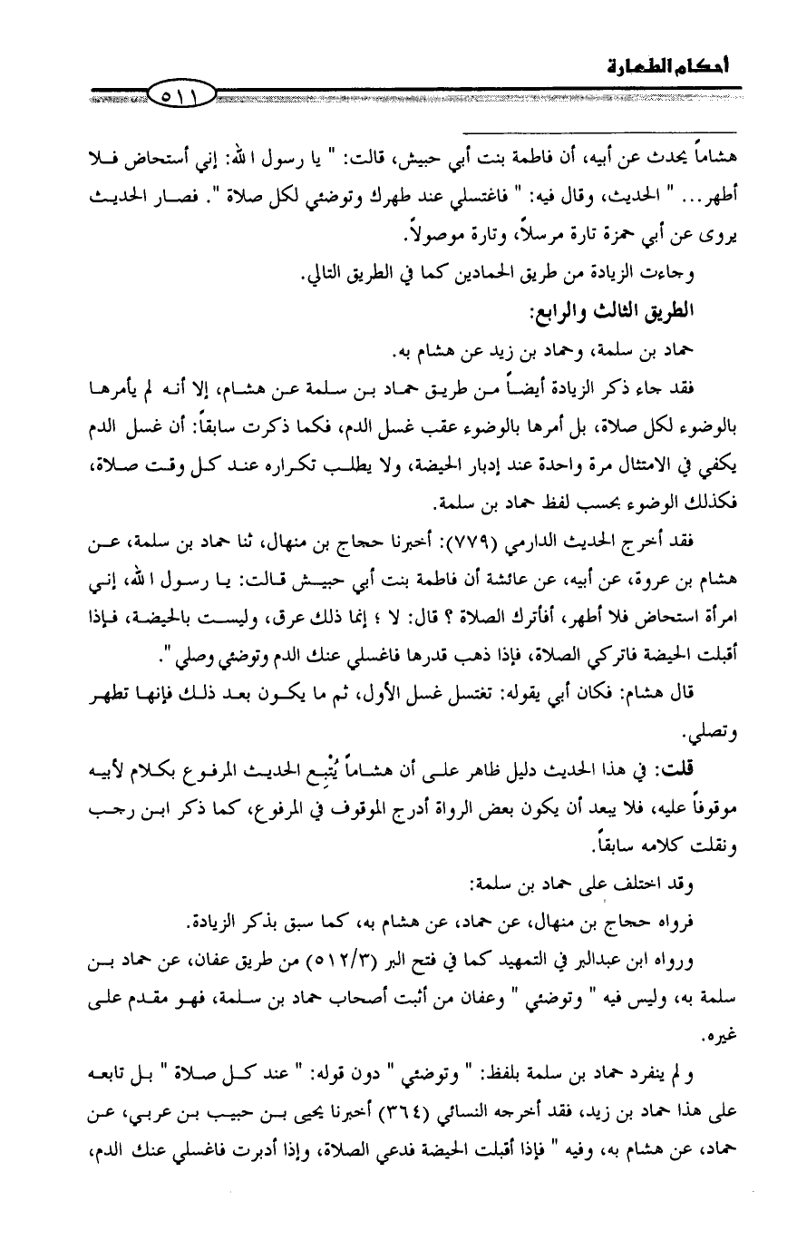 ولم ينفرد حماد بن سلمة بلفظ: " وتوضئي " دون قوله: " عند كل صلاة " بل تابعه على هذا حماد بن زيد، فقد أخرجه النسائي (٣٦٤) أخبرنا يحيى بن حبيب بن عربي، عن حماد، عن هشام به، وفيه " فإذا أقبلت الحيضة فدعي الصلاة، وإذا أدبرت فاغسلي عنك الدم، =