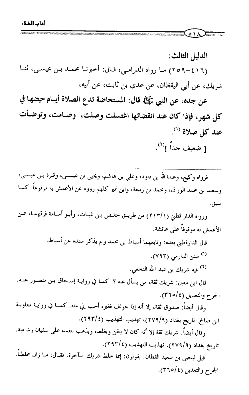 (٤١٤ - ٢٥٨) ما رواه الدرامي، قال: أخبرنا محمد بن عيسى، ثنا شريك، عن أبي اليقظان، عن عدي بن ثابت، عن أبيه، عن جده، عن النبي - صلى الله عليه وسلم - قال: