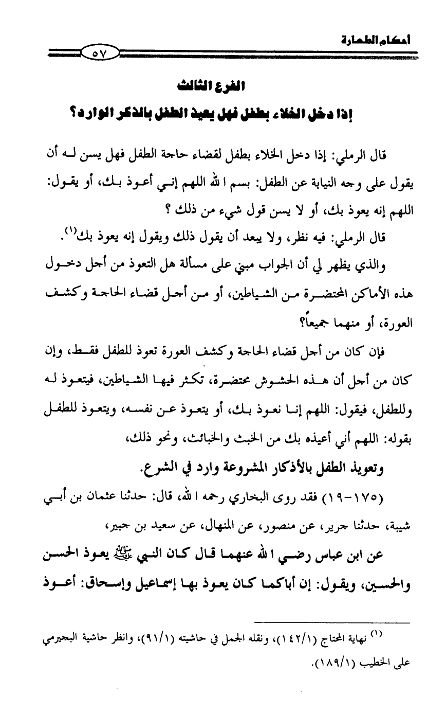 الفرع الثالث إذا دخل الخلاء بطفل فهل يعيذ الطفل بالذكر الوارد؟