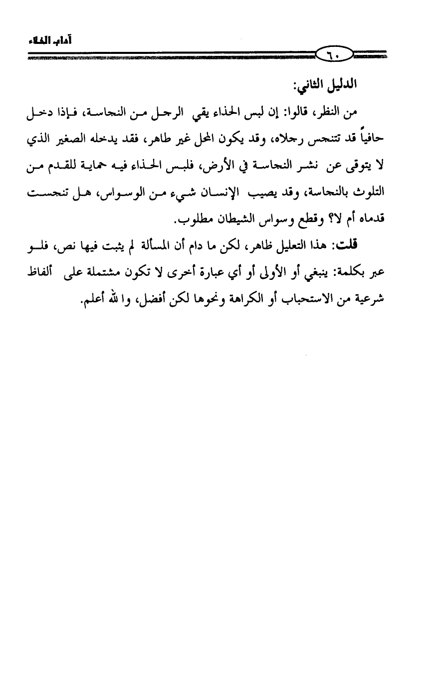 من النظر، قالوا: إن لبس الحذاء يقي الرجل من النجاسة، فإذا دخل حافياً قد تتنجس رجلاه، وقد يكون المحل غير طاهر، فقد يدخله الصغير الذي لا يتوقى عن نشر النجاسة في الأرض، فلبس الحذاء فيه حماية للقدم من التلوث بالنجاسة، وقد يصيب الإنسان شيء من الوسواس، هل تنجست قدماه أم لا؟ وقطع وسواس الشيطان مطلوب.