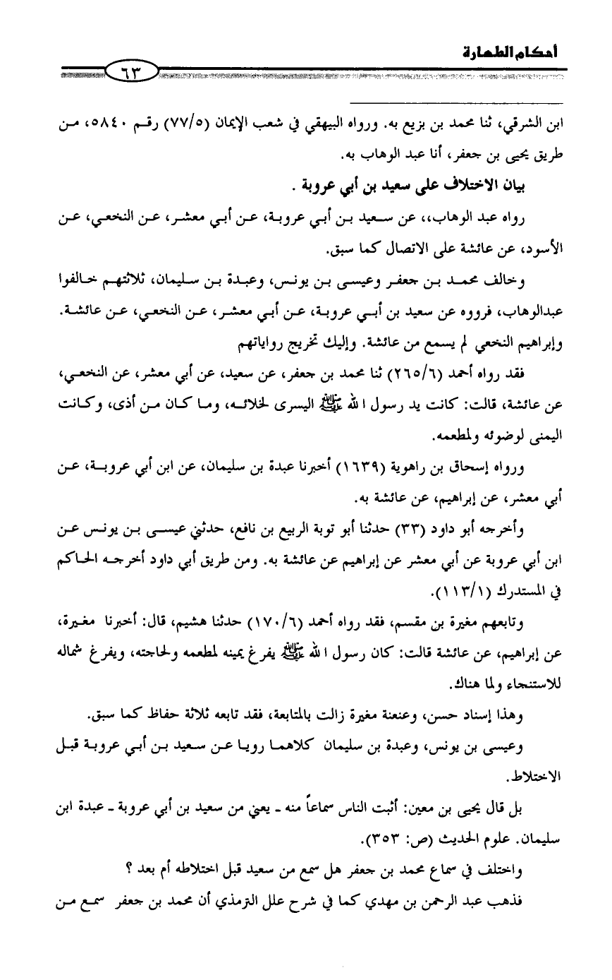 وخالف محمد بن جعفر وعيسى بن يونس، وعبدة بن سليمان، ثلاثتهم خالفوا عبد الوهاب، فرووه عن سعيد بن أبي عروبة، عن أبي معشر، عن النخعي، عن عائشة. وإبراهيم النخعي لم يسمع من عائشة. وإليك تخريج رواياتهم