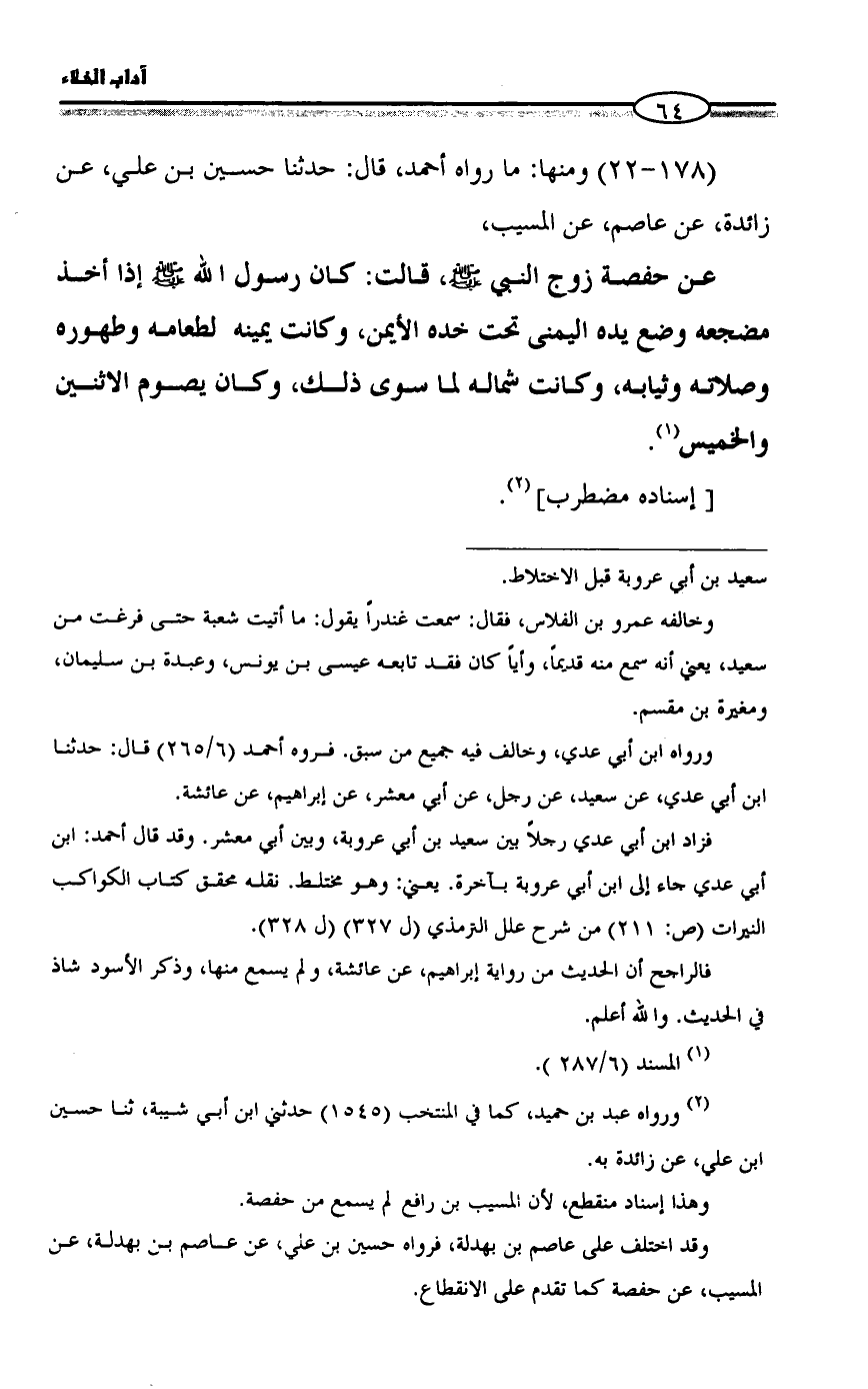 (١٧٨ - ٢٢) ومنها: ما رواه أحمد، قال: حدثنا حسين بن علي، عن زائدة، عن عاصم، عن المسيب،