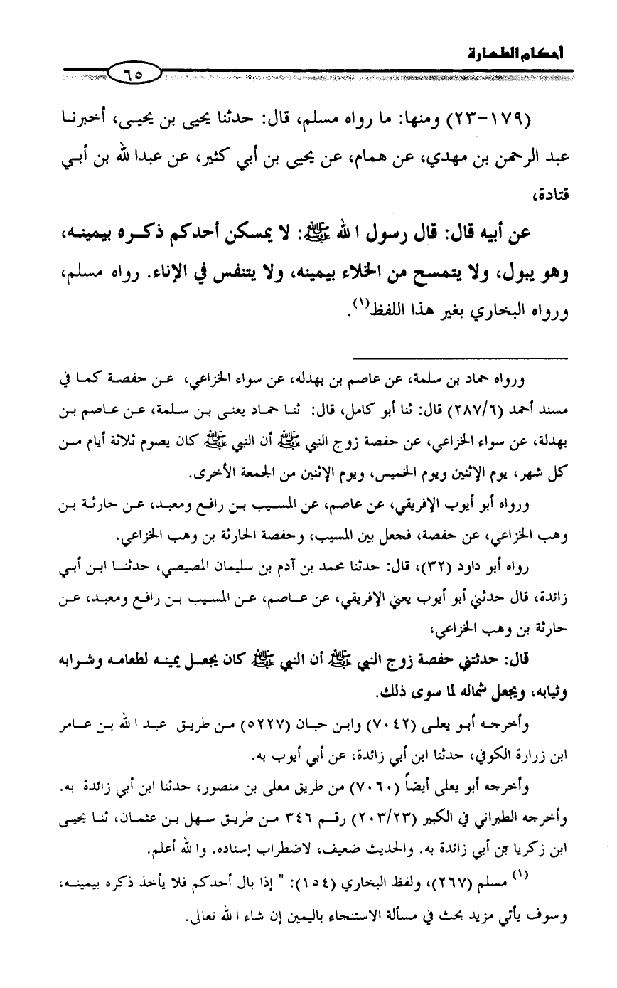 (¬١) مسلم (٢٦٧)، ولفظ البخاري (١٥٤): " إذا بال أحدكم فلا يأخذ ذكره بيمينه، وسوف يأتي مزيد بحث في مسألة الاستنجاء باليمين إن شاء الله تعالى.