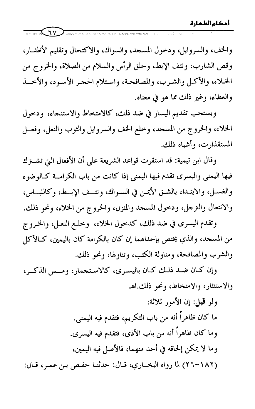 وقال ابن تيمية: قد استقرت قواعد الشريعة على أن الأفعال التي تشترك فيها اليمنى واليسرى تقدم فيها اليمنى إذا كانت من باب الكرامة كالوضوء والغسل، والابتداء بالشق الأيمن في السواك، ونتف الإبط، وكاللباس، والانتعال والترجل، ودخول المسجد والمنزل، والخروج من الخلاء، ونحو ذلك.