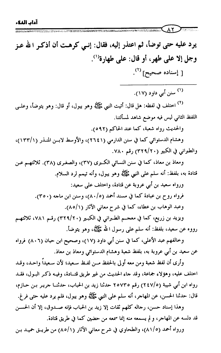 وأرى أن لفظ شعبة ومن معه أولى بالحفظ من لفظ سعيد؛ لأن سعيداً واحد، وقد اختلف عليه، وهؤلاء جماعة، وقد جاء الحديث من غير طريق قتادة، وفيه ذكر البول، فقد رواه ابن أبي شيبة (٥/ ٢٤٧) رقم ٢٥٧٣٥ حدثنا زيد بن الحباب، حدثنا جرير بن حازم، قال: حدثنا الحسن، عن المهاجر، أنه سلم على النبي - صلى الله عليه وسلم - وهو يبول، فلم يرد عليه حتى فرغ.